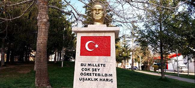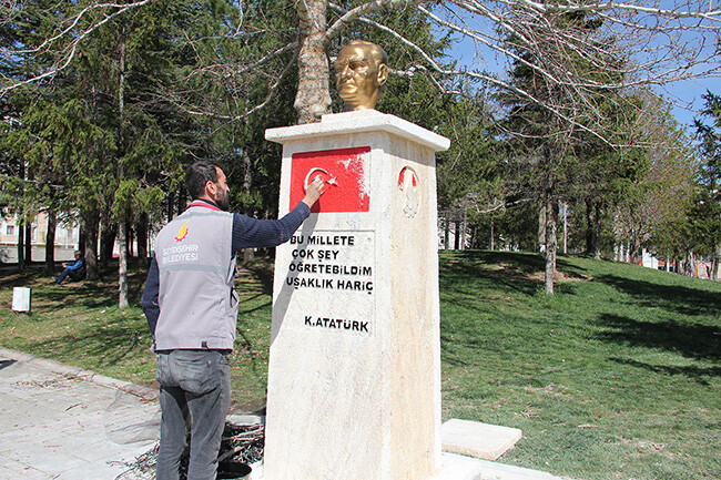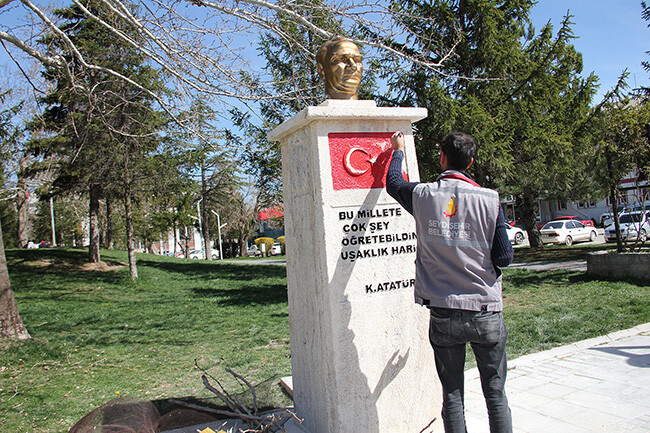Tören meydanda olur. Belediye meydanı çok güzel fakat Atatürk büstü daha heybetli olabilirdi. Platformun üzerinde Atatürk büstü çok ufak kalmış. Bayrak asılacak demir direkler yer almamış.
