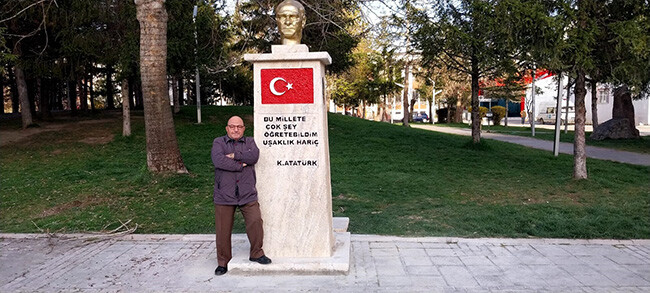 Okul bahçelerinde olabilecek bir büst görüntüsü sergilenmiş. Atatürk anıtı tam manasıyla görünmüyor.