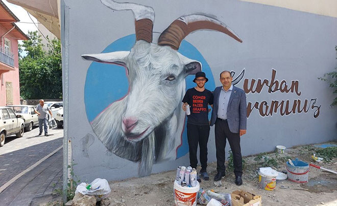 Beş ay önce Seydişehir’de Esra Erol ile evlenen Brezilyalı Luis Henrique Souza Da Silva, ilk kez Müslüman bir ülkede kurban bayramı geçireceği için çarşı merkezindeki otoparkın duvarına kurbanlık keçi resmi yaptı.