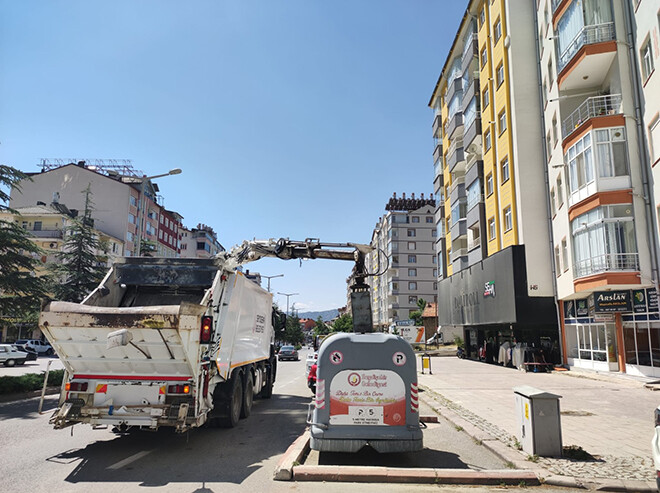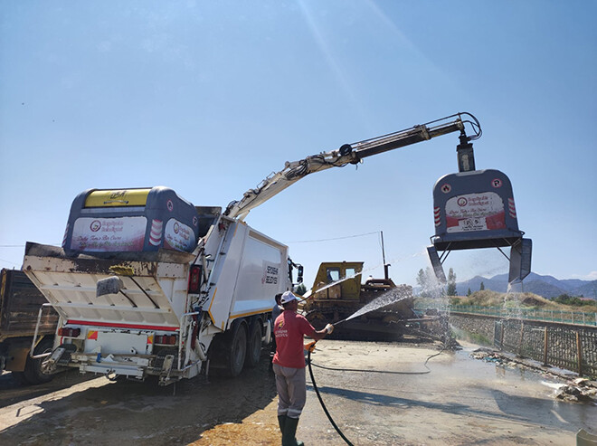 Ekipler Kurban Bayramı sonrası çöplere atılan atıkların kötü kokuya ve çevre kirliliğine sebebiyet vermemesi için ilçe genelinde tüm mahallelerde bulunan konteynerleri yıkayarak, bakteri öldürücü ve koku giderici anti bakteriyel ilaçlarla temizledi.