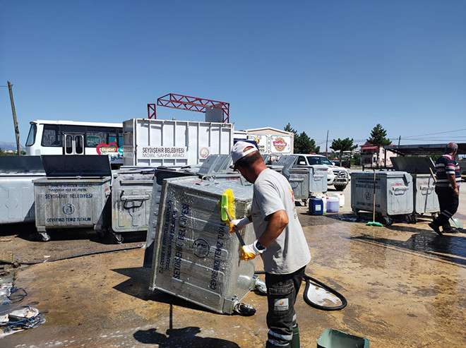 Seydişehir Belediyesi ekipleri, Kurban Bayramı sonrası çöp konteynerlerinde oluşan kötü koku ve atıkların giderilmesi için yıkama ve dezenfekte çalışmalarına başladı.