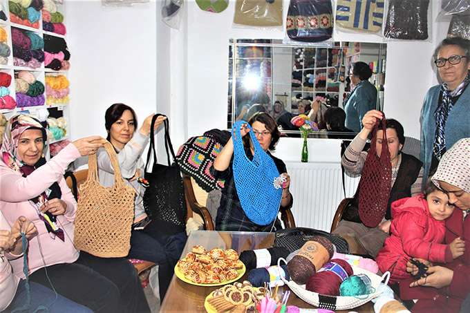 Seydişehir Rengârenk örgü evi meslek ve sanat eğitimi kurslarında kadınlar, poşet uygulamasının ardından ördükleri alışveriş fileleriyle projeye hem destek verdiler hem de satışa çıkarttılar.