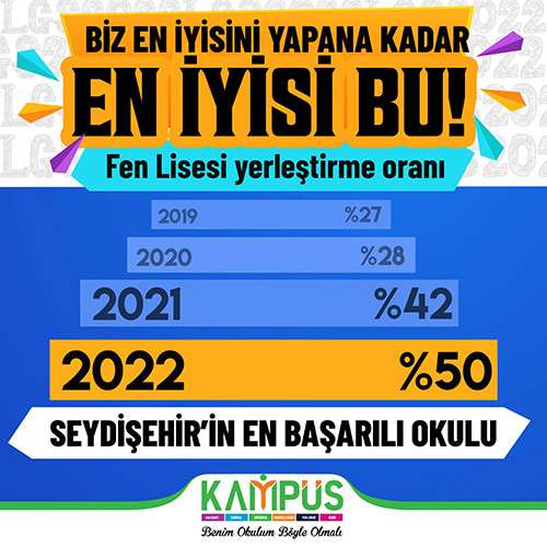 Olan kampüs okulları bu yıl ise bu oranını %50 ye çıkararak ulaşılması nerdeyse imkânsız olan bir başarıya ulaştı. Kitlesel başarının yanı sora bireysel başarıda da kendinden söz etmeye devam eden kampüs okulları ilçemizde bir ilki başararak TÜBİTAK fen lisesine bir öğrencisini TÜRKİYE 69.su olarak yerleştirdi ayrıca iki öğrencisini Meram fen lisesine yerleştirdi.
