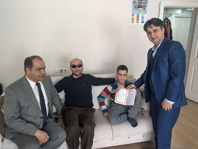 Kaymakam Aydın Erdoğan İlçe Milli Eğitim Müdürü Tahir Kibar ve görme engelli Av. İsa Koca ile birlikte evde eğitim hizmeti alan görme ve bedensel engelli 4. sınıf öğrencisi Erencan Çağlar’ ı ziyaret etti.