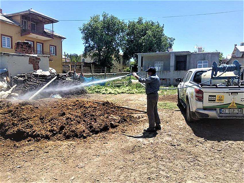 Seydişehir Belediye ekipleri, kırsal mahallelerde hayvancılığın yaygın olduğu ahırlar ve hayvansal atıkların bulunduğu alanlarda ilaçlama çalışması yaparak, zararlı haşerelerin ve sineklerin üremesinin önüne geçiyor. Çalışmalarla halk sağlığını tehdit edecek unsurların oluşması engelleniyor.