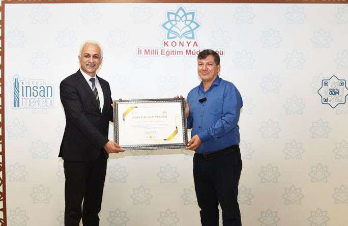 Konya İl milli eğitim müdür yardımcısı Nizamettin Doğan, okul müdürü Zafer Ülkebaş’a düzenlenen törende ödülü takdim etti.