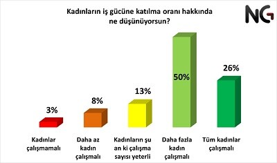 Türkiye’de kadınların iş gücüne katılım oranı son yıllarda artış gösterse de hala dünya ortalamasının oldukça gerisinde. Ankete katılanların yarısı daha fazla kadının çalışması gerektiğini düşünürken, %26’sı ise tüm kadınların çalışması gerektiğini savunuyor.