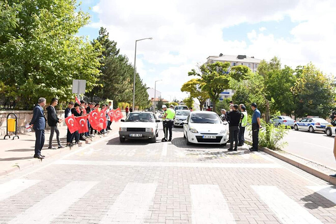 Yaya önceliğine dikkat çeken Kaymakam Pişkin, ‘’Bazen sürücü, bazen yayayız ve hayatı birlikte yaşıyoruz. Hayatın her noktasında olduğu gibi trafikte de birbirimizin haklarına saygı göstereceğiz. Kazasız, belasız bir trafik akışı diliyorum.” ifadelerini kullandı.