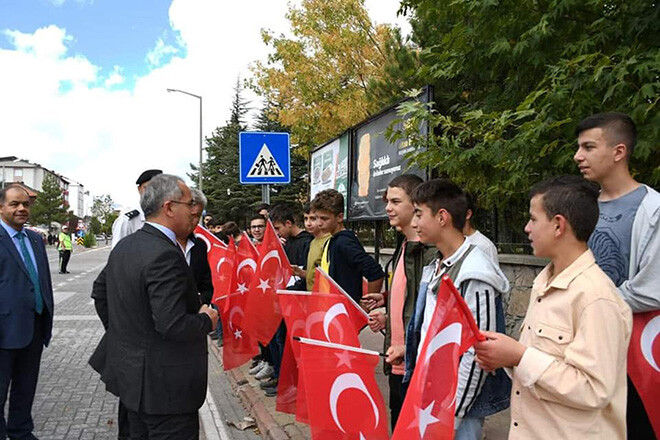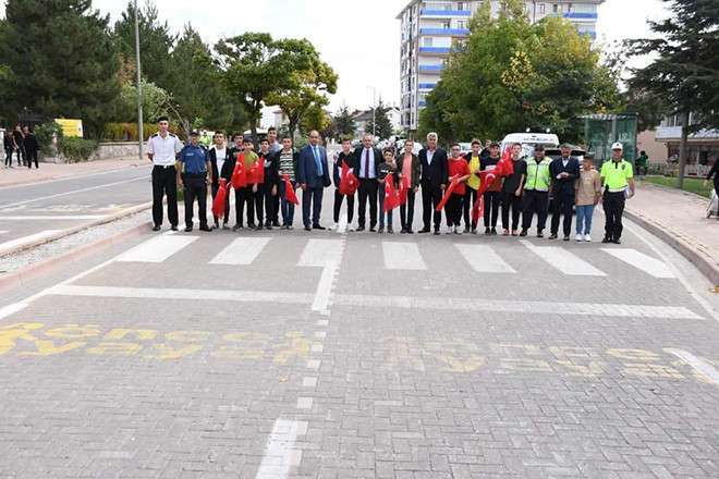 Sadi Irmak Caddesi okullar bölgesinde düzenlenen farkındalık kampanyasında öğrencilere ve sürücülere broşür dağıtıp yaya geçidinin önemini anlatan Kaymakam Deniz Pişkin, küçük yaşlarda trafik bilincinin yerleşmesinin hayati önem taşıdığını söyledi.